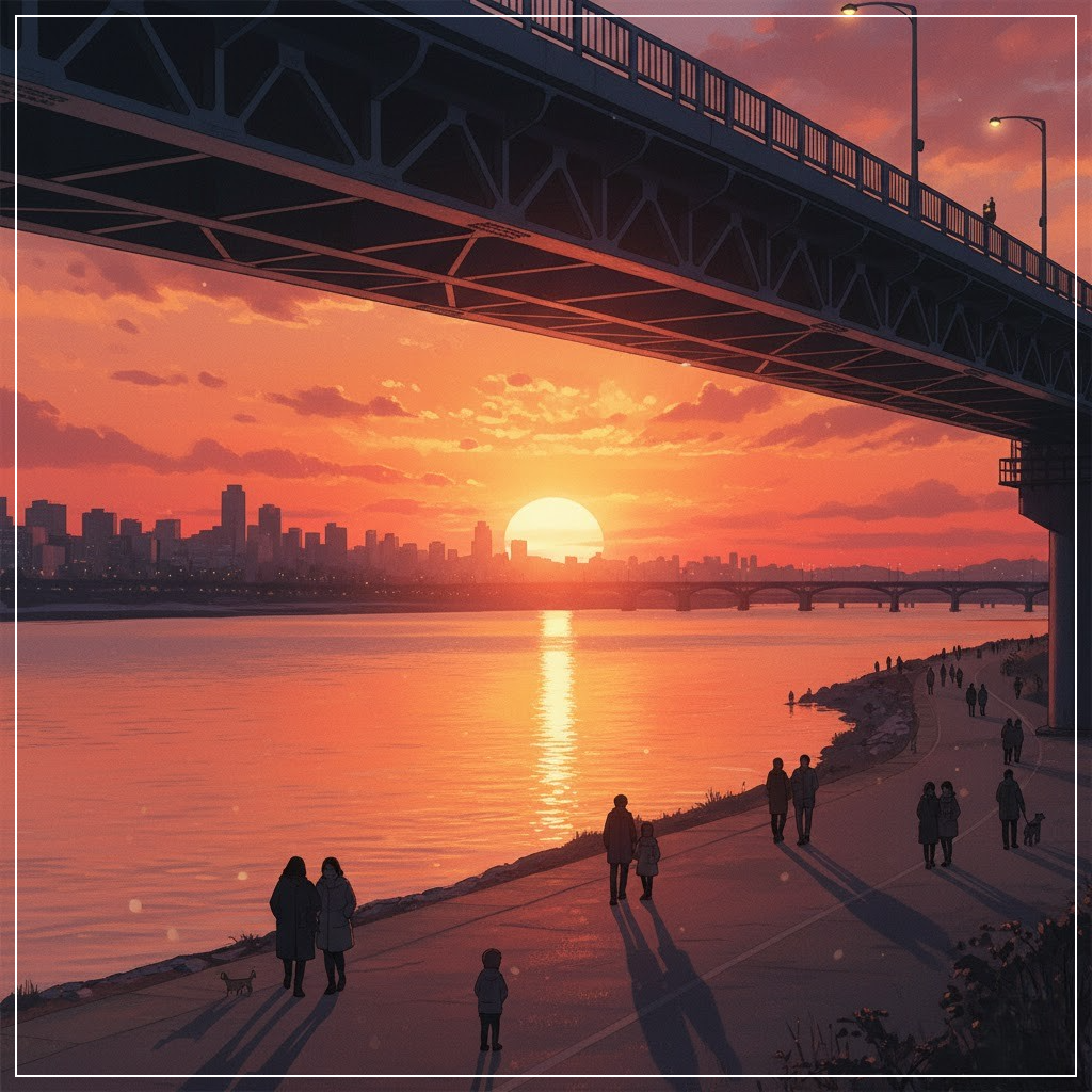 🌉 2️⃣ 반포 한강공원 — 해 질 무렵, 도시의 노을 속으로