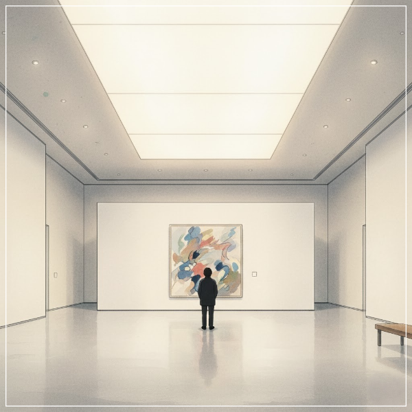 설명: “국립현대미술관 전시관 내부, 여백이 강조된 공간에서 작품을 바라보는 관람객의 실루엣.”