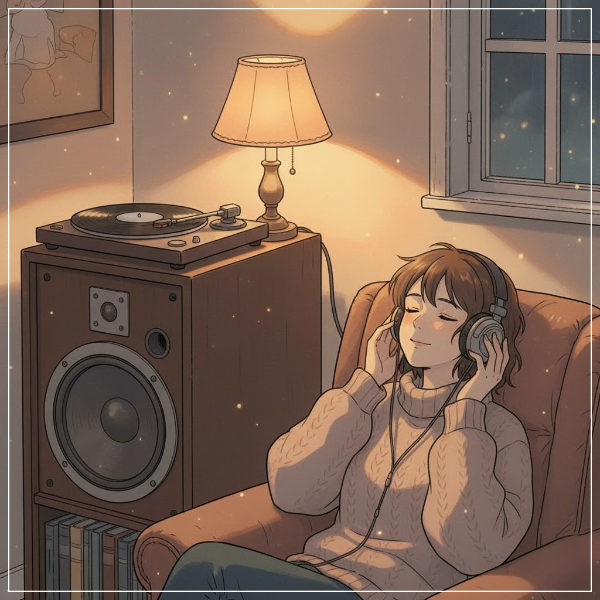 설명: “스피커 위에 놓인 LP판과 따뜻한 조명, 음악에 맞춰 눈을 감고 고개를 끄덕이는 모습.”