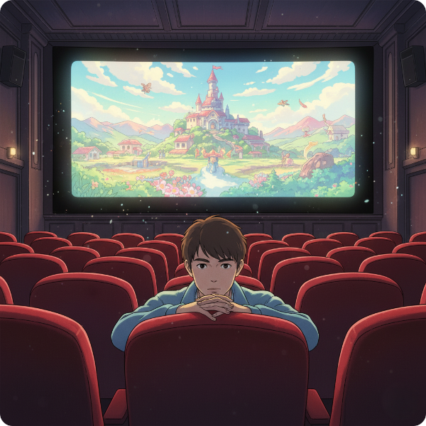 “조용한 영화관에서 관객이 스크린을 집중해서 바라보는 모습.”
